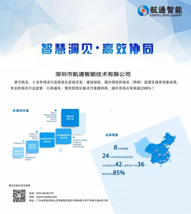 航通智能是國家級高新技術(shù)企業(yè)和雙軟認(rèn)證企業(yè),并獲得CMMI3資質(zhì)認(rèn)證。歷程十五載,航通智能已于海關(guān)行業(yè)監(jiān)管、口岸通關(guān)、保稅物流、加工貿(mào)易、物流信息化應(yīng)用集成領(lǐng)域在全國建設(shè)了數(shù)百個特殊監(jiān)管區(qū)與和監(jiān)管場所信息化系統(tǒng)。其中涉及云卡口、大數(shù)據(jù)風(fēng)險分析、北斗/GPS監(jiān)控應(yīng)用、RFID射頻識別、移動智能終端等應(yīng)用技術(shù)。業(yè)務(wù)覆蓋全國42個直屬海關(guān)中的36個,關(guān)區(qū)覆蓋率超過85%,核心業(yè)務(wù)市場占有突破60%。