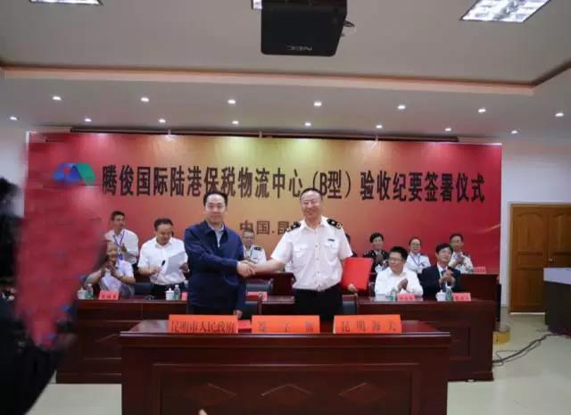 昆明海關(guān)副關(guān)長馬軍與昆明市人民政府副市長洪維智簽署了《騰俊國際陸港保稅物流中心基礎(chǔ)和監(jiān)管設(shè)施驗收紀要》。昆明市人民政府高庚副秘書長、晉寧區(qū)人民政府李福軍區(qū)長、昆明市商務(wù)和投資促進局徐增雄局長、及省、市、區(qū)各級有關(guān)部門負責人參加了驗收工作。
