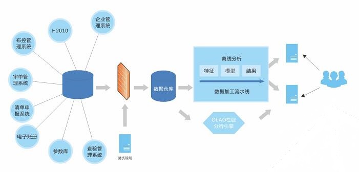 系統(tǒng)整合現(xiàn)有H2010通關(guān)管理系統(tǒng)和各信息系統(tǒng)的數(shù)據(jù),通過添加智能對象特征實現(xiàn)各類數(shù)據(jù)的分類;通過數(shù)據(jù)建模實現(xiàn)分析方法的模塊化、程序化、可視化;利用大數(shù)據(jù)云計算功能實現(xiàn)數(shù)據(jù)的智能分析和加工,按照異動信息、一般貿(mào)易風險分析、加工貿(mào)易風險分析和主要稅源商品風險分析四大門類進行結(jié)果展示。